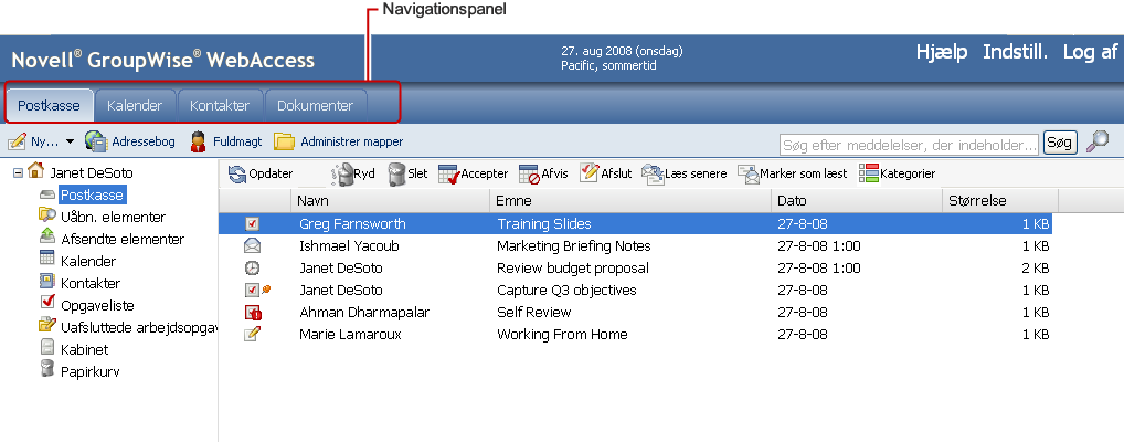 Navigationspanelet er placeret øverst i GroupWise-vinduet. Det er udviklet med henblik på hurtig adgang til de mapper, du bruger mest. Som standard indeholder navigationspanelet mapperne Postkasse, Kalender, Kontakter og Dokumenter.