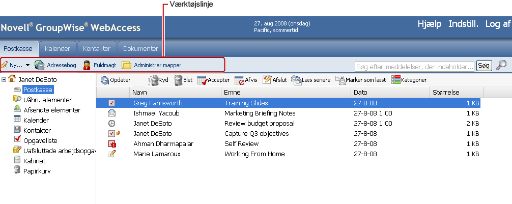 Brug værktøjslinjen til at få adgang til funktioner og indstillinger i GroupWise. Værktøjslinjen øverst i en mappe eller et element er kontekstafhængig, og den ændrer sig for at give dig de funktioner, du har mest brug for i den givne kontekst.